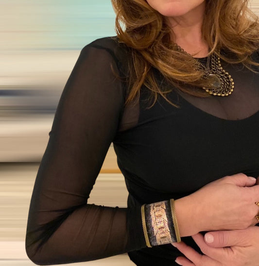 Inspired by Magritte's "Ceci n'est pas une Pipe" painting, these whimsical Shimmery Cuffs (with touches of strategically matte crystal accents to highlight the shine) are original and impactful. They redefine elegance, transcending the ordinary and elevating your everyday look into something extraordinary.