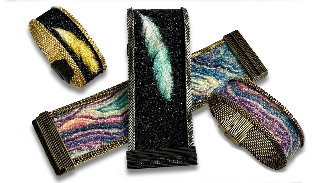 Limited edition cuffs with shimmery agate-inspired patterns to ground your energy.